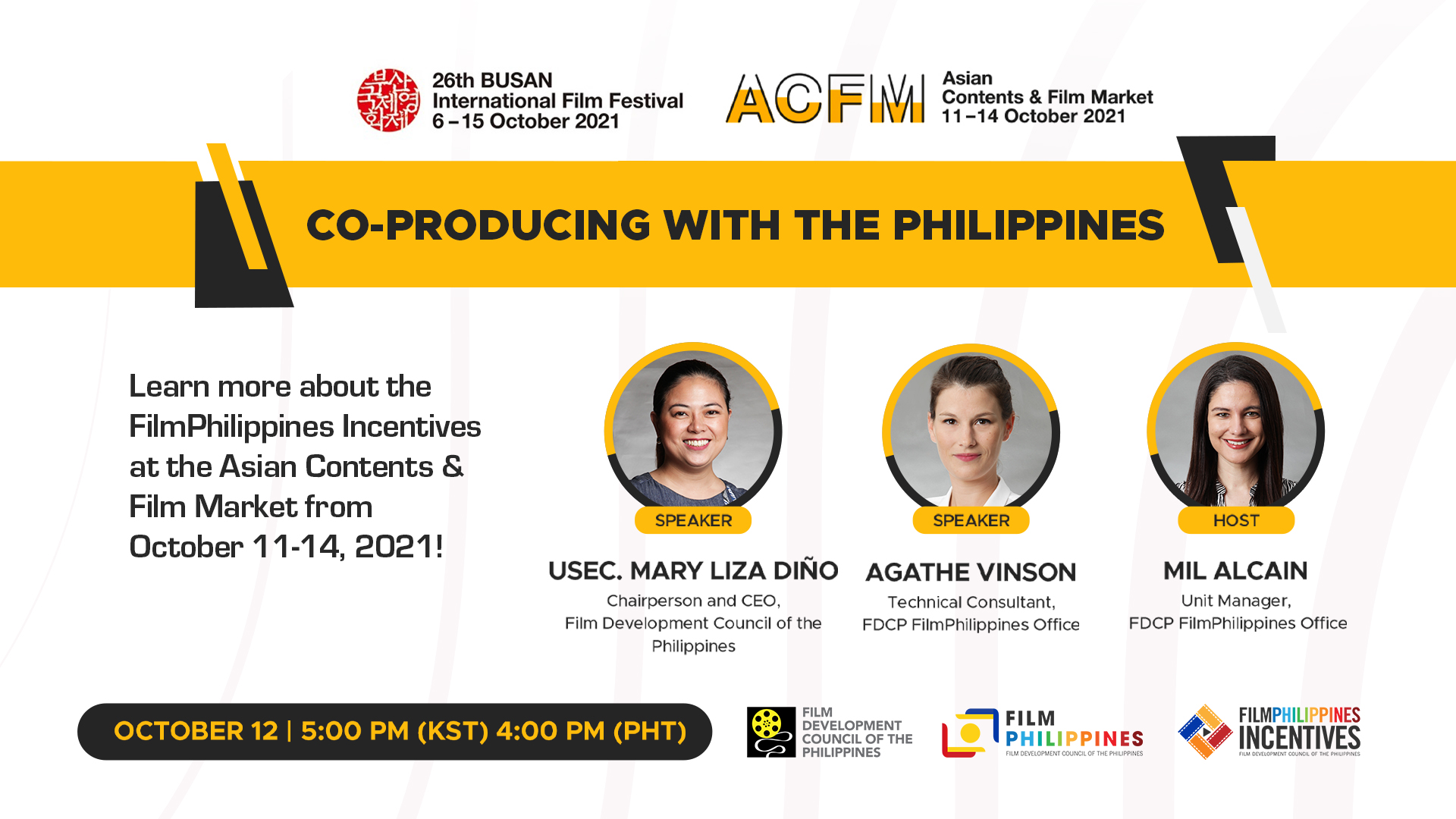 This year, FDCP hosted the online panel discussion titled “Co-Producing with the Philippines” on October 12 and a virtual Philippine pavilion with seven local companies: Sine Caboloan Ltd. Co., ABS-CBN (International Production & Co-Production), ABS-CBN Film Productions, Inc., Eichef Media \ HFilms Co., Cignal Entertainment, The Producers Asia, and KT House Productions Inc.