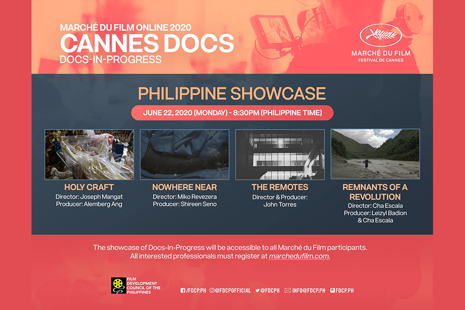 This year, four films from the Philippines will be showcased at Marche du Film by the Film Development Council of the Philippines at the Cannes Docs Online 2020. As one of FDCP’s focus this year is on empowering Filipino documentary films and providing filmmakers and producers more platforms, the Agency partnered with Cannes Docs Online 2020 to hold “Showcase Philippines” on June 22 as one of the eight showcases. Under the Philippines, the documentaries Holy Craft (dir. Joseph Mangat), Nowhere Near (dir. Miko Revereza), Remnants of a Revolution (dir. Cha Escala), and The Remotes (dir. John Torres) will be presented through a pitch and a 10-minute sequence of the rough cut. Each film screened will have the opportunity to win various prizes including the €10,000 Docs-in-Progress Award, supported by IEFTA.